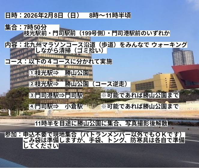 集合:7時50分 枝光駅前・門司駅前(199号側)・門司港駅前のいずれか